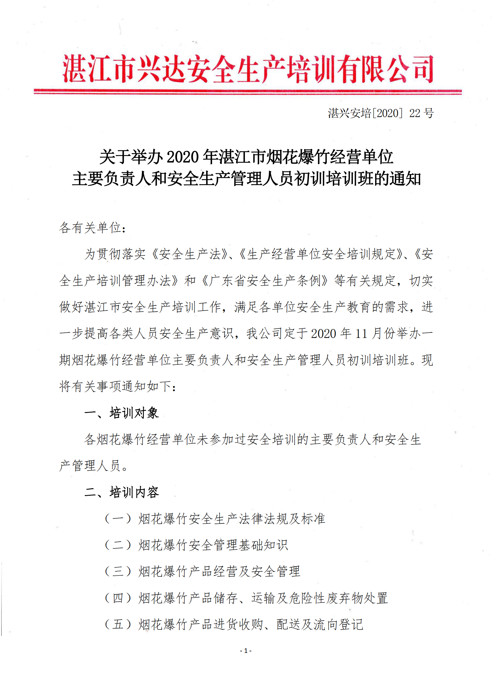 烟花爆竹主要负责人和安管人员初训通知(11.30-12.5)